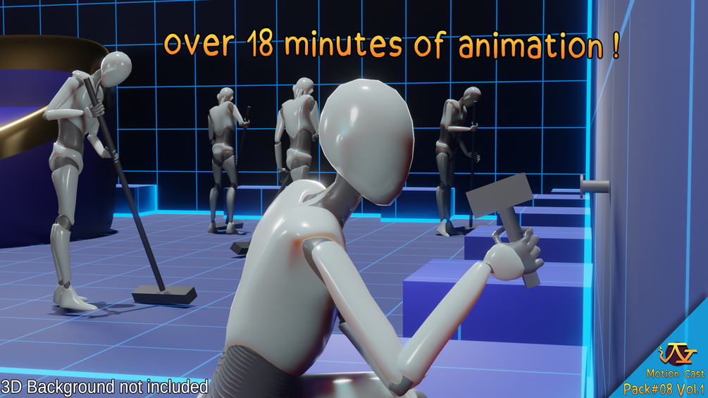 In this animation pack, we propose several animations of various workers and in several fields, while remaining in connection with the manual work. We have thought the animation in the long term, that is to say that these animations will be quite long. All animations are captured in motion capture at 30 FPS and retouched manually. The motion capture was performed by Stéphane Pfeffer, who did a lot of manual work through the interim.